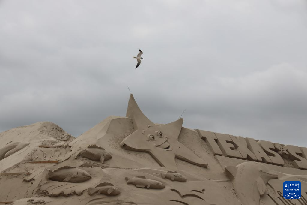 这是4月21日在美国得克萨斯州阿兰瑟斯港拍摄的沙雕。