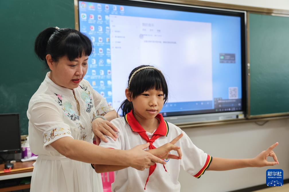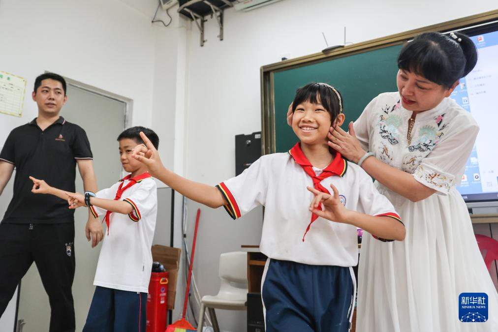 4月24日,海南定安县琼剧团的演员指导定安县第一小学的学生们练习琼剧。