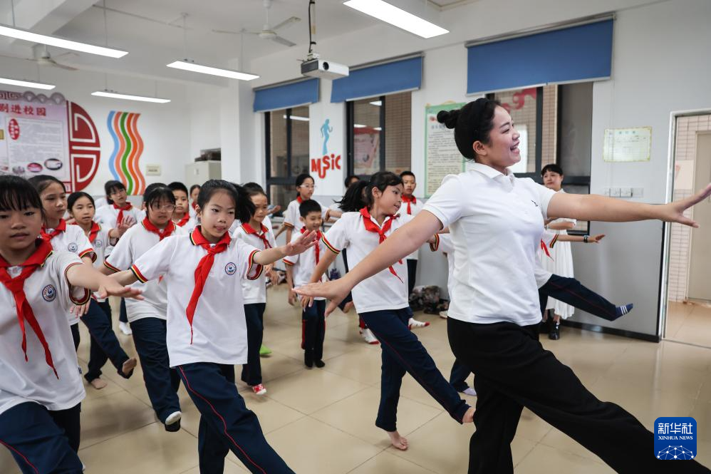4月24日,海南定安县琼剧团的演员带领定安县第一小学的学生们做琼剧操。