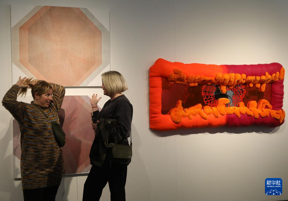 4月25日,在美国旧金山梅森堡中心举行的旧金山艺术博览会上,人们观看艺术作品。