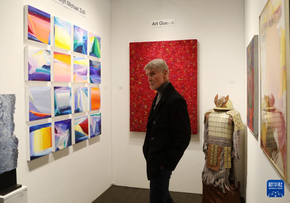 4月25日,在美国旧金山梅森堡中心举行的旧金山艺术博览会上,一名男子观看艺术作品。