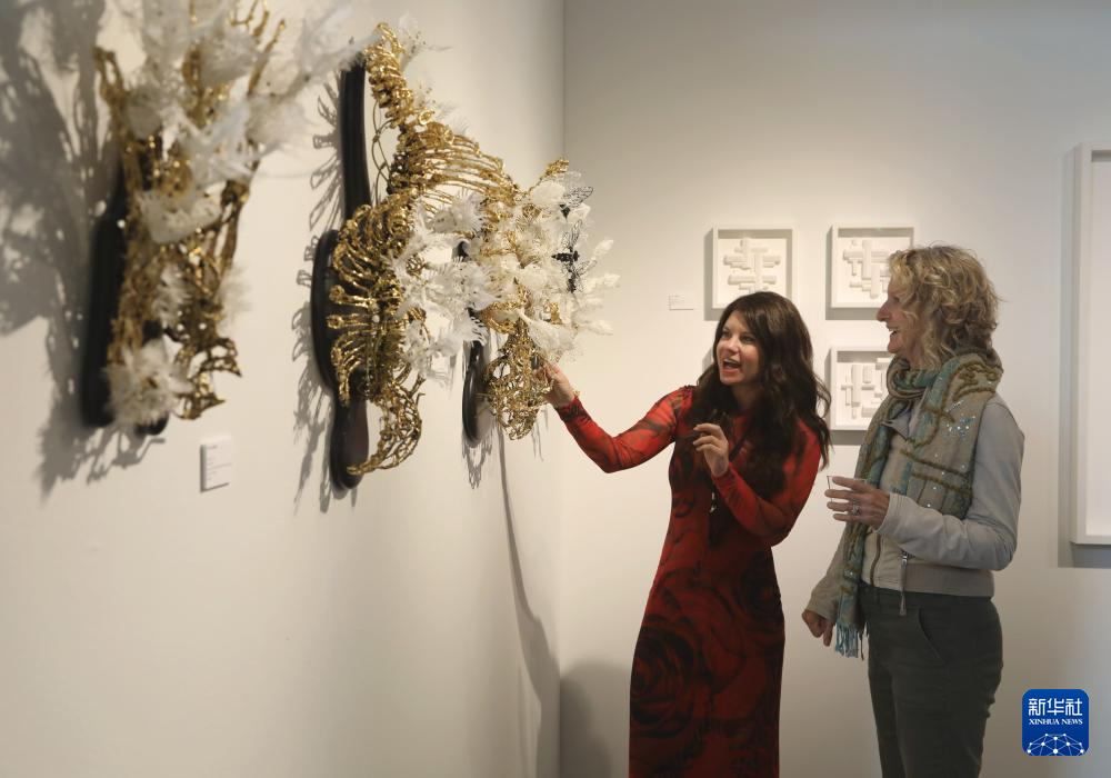 4月25日,在美国旧金山梅森堡中心举行的旧金山艺术博览会上,人们在艺术作品前交谈。