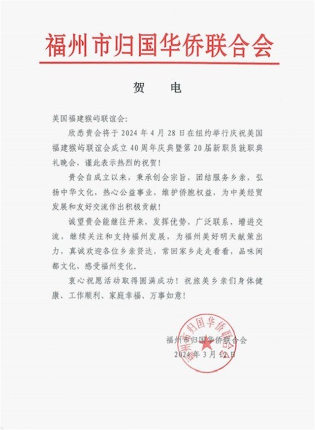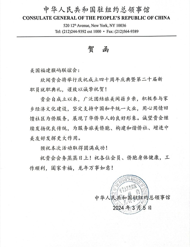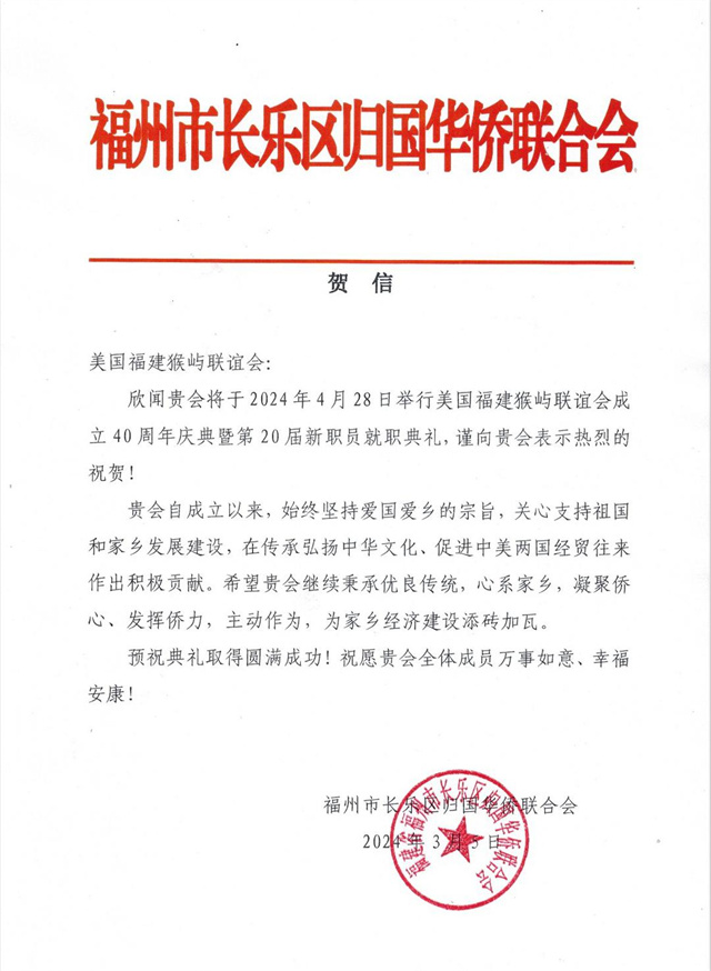 此次活动收到来自中国驻纽约总领馆、福建省侨联、福州市侨联、福州市长乐区侨联、长乐区侨办、长乐区海外联谊会、长乐区候屿乡人民政府、长乐区猴屿乡猴屿村村委会等发来的贺信。
