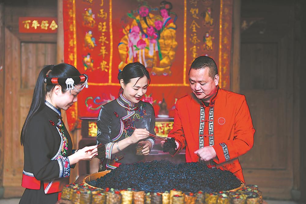 As the festival approaches, every household begins to make black rice in Lianling Village of Bangzhong She Ethnic Group Country, Fu'an City. The She Ethnic Group people pound the leaves of the Vaccinium Bracteatum Thunb and filter the juice, which is then used to dye white glutinous rice black. After that, it is cooked until it becomes a delicious, shiny, and fragrant black rice. According to reports, black rice has dietary therapeutic effects, such as appetizing, strengthening the spleen, and dispelling dampness in the body.