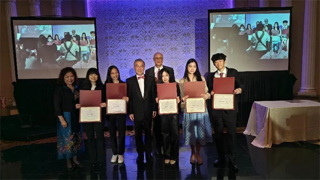 年会上,黄屏还为基金会评选出的年度杰出亚裔青年颁发了奖学金,并与在场各界嘉宾友好互动交流。