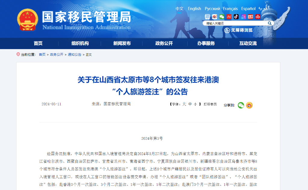 新华社北京5月11日电(记者 任沁沁)记者11日获悉,经国务院批准,中华人民共和国出入境管理局决定自2024年5月27日起,为山西省太原市、内蒙古自治区呼和浩特市、黑龙江省哈尔滨市、西藏自治区拉萨市、甘肃省兰州市、青海省西宁市、宁夏回族自治区银川市、新疆维吾尔自治区乌鲁木齐市等8个城市符合条件人员签发往来港澳“个人旅游签注”。