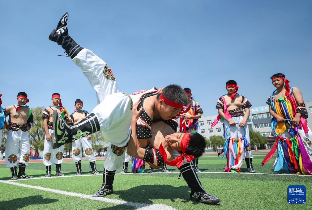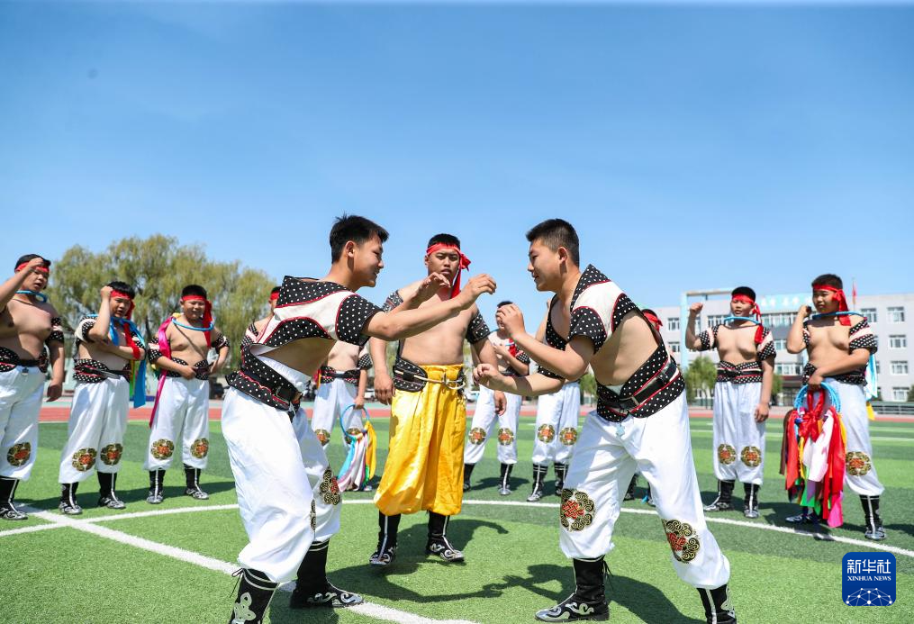 5月15日,在阜新蒙古族自治县蒙古族初级中学,该校搏克队队员在训练。