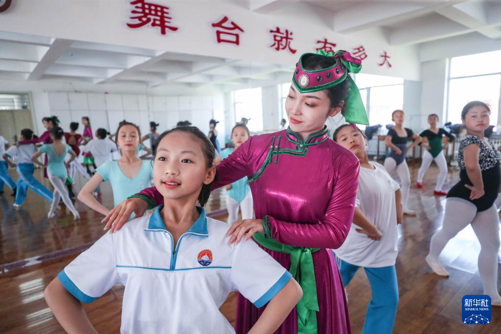 5月15日,在阜新蒙古族自治县蒙古族实验小学,阜新蒙古族自治县文化旅游服务中心的舞蹈演员指导学生练习蒙古舞。