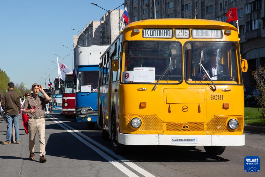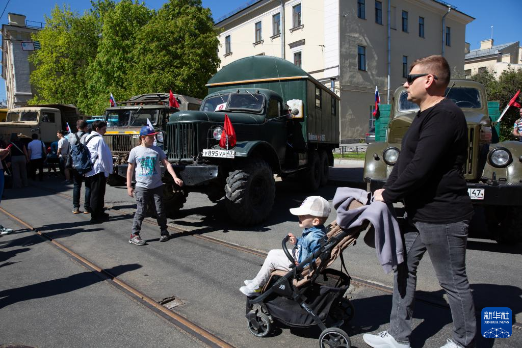 5月18日,在俄罗斯圣彼得堡,人们参加老爷车街头巡游活动。
