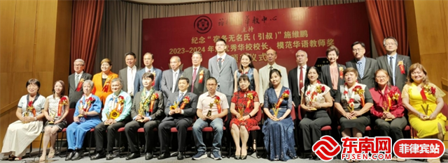 东南网5月21日讯(特约记者 洪宾宾)5月19日,菲律宾华教中心在菲律宾国际会议中心举行纪念“宿务无名氏(引叔)”施维鹏2023-2024学年年度优秀华校校长奖、模范华语教师奖颁奖典礼。中国驻菲律宾大使馆领事曹凯文,奖学金设立人施维鹏后裔施美清,华教中心主席黄端铭,教师奖获奖者代表,菲律宾各华校代表及华社团体代表等近400人参加典礼。颁奖仪式由侨中总校中文教师周越邯主持。