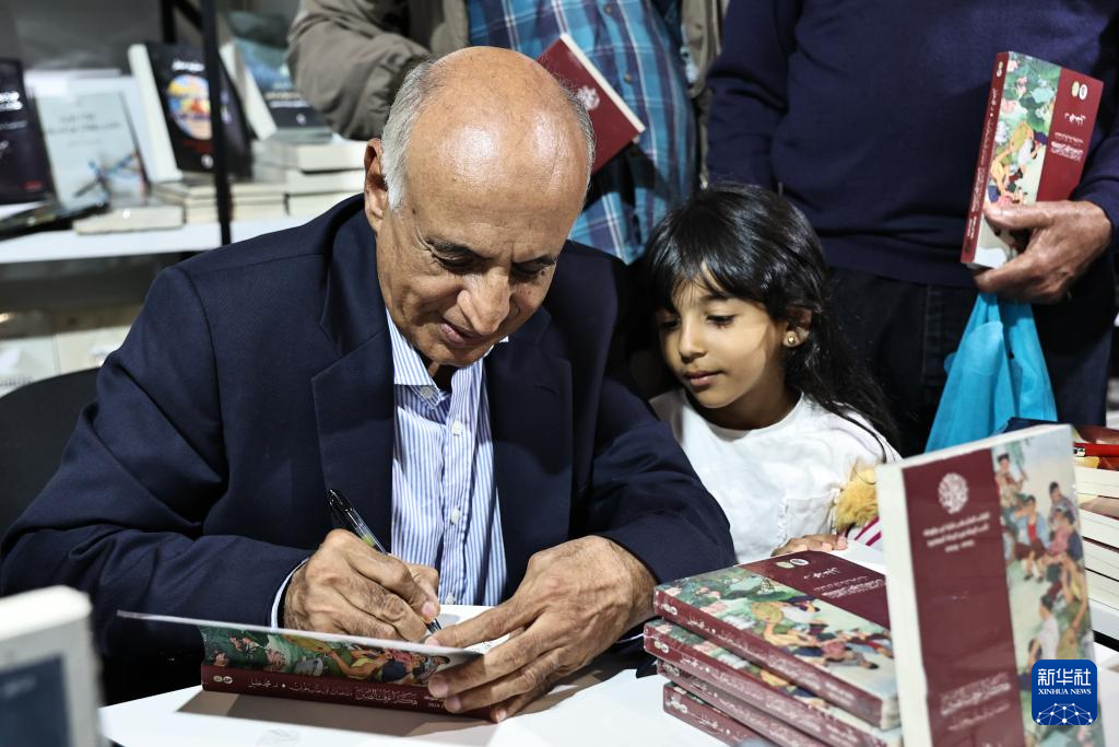 5月18日,在摩洛哥拉巴特第29届拉巴特书展现场,摩洛哥中国友好交流协会会长穆罕默德·哈利勒在其新书《我如何认识中国》发布活动上为一名小读者签名留念。