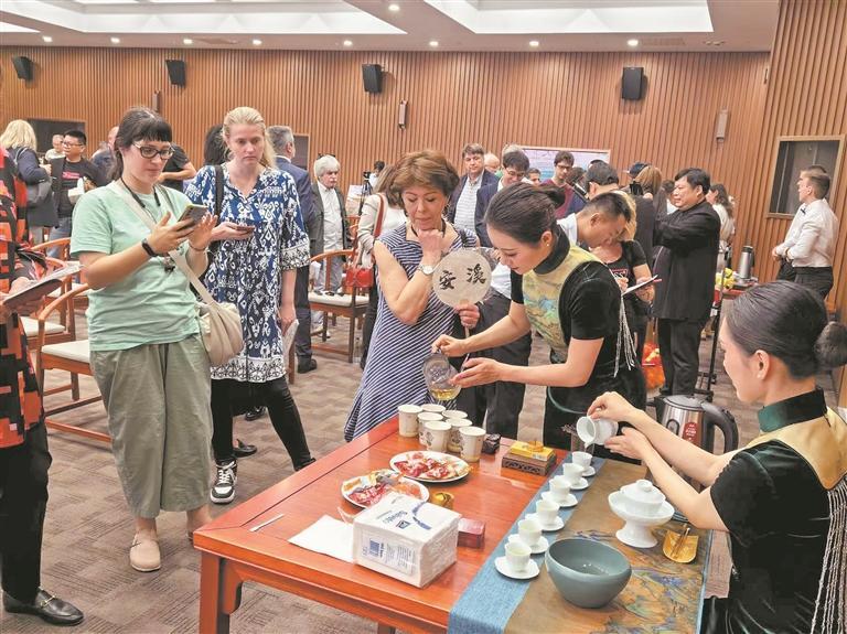 活动现场,来自泉州的茶艺师展示了安溪铁观音传统茶艺,以安溪铁观音传统制茶工艺为创作背景的采茶舞,生动展现了安溪铁观音的茶文化魅力。嘉宾们全神贯注地欣赏精彩的茶艺表演,通过观色、闻香、辨形、品茗感受茶文化精髓。泉州的艺术家还以精湛的技艺展现泉州非遗项目,提线木偶、高甲戏、火鼎公婆等精彩表演,令观众掌声不绝,将气氛推向高潮。