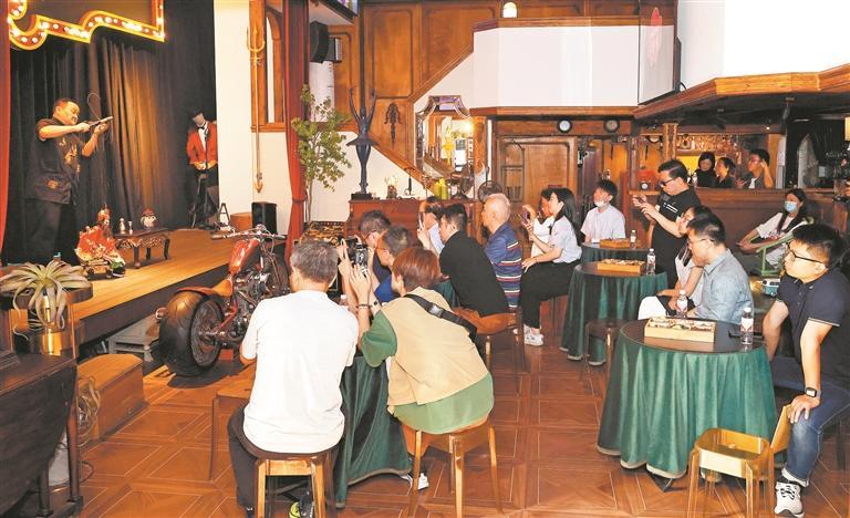 随后,活灵活现的木偶戏表演《钟馗醉酒》在剧场亮相,在看到钟馗喝得酩酊大醉不忘斩妖除魔时,考察团成员纷纷拿出手机记录这生动的表演。在表演结束后,嘉宾们依次上台体验了一把“指上非遗”,在木偶大师的指导下,他们学会了提线木偶的简单操作。