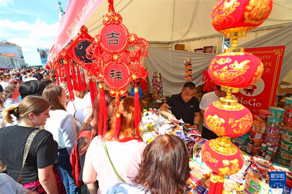 6月1日,人们在白俄罗斯明斯克“茶和天下·雅集”活动现场购买中国食品。