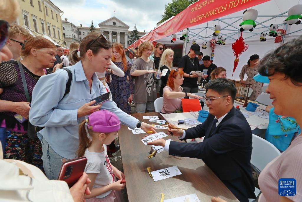 6月1日,人们在白俄罗斯明斯克“茶和天下·雅集”活动现场体验汉字文化。
