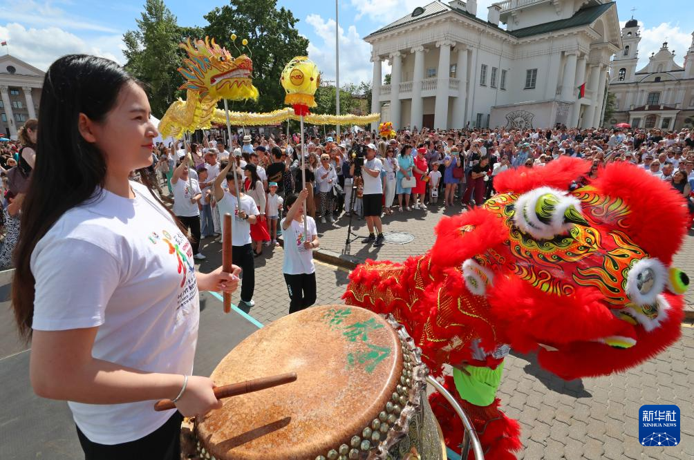 6月1日,白俄罗斯孔子学院师生在明斯克“茶和天下·雅集”活动上表演舞龙舞狮。