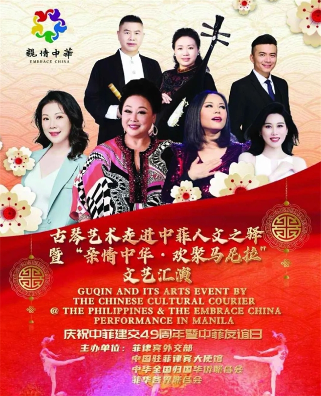 东南网6月7日讯(特约记者 洪宾宾)为庆祝中菲建交49周年暨“中菲友谊日”,“古琴艺术走进中菲人文之驿暨亲情中华·欢聚马尼拉”大型文艺汇演将于6月9日晚在菲律宾马尼拉举行。届时,包括中华全国总工会文工团国家一级演员、女高音歌唱家郑咏,国家一级演员、中国东方演艺集团声乐总监郭蓉,闽籍国家级非物质文化遗产代表性项目(南音)省级传承人、泉州市文化宫南音社社长陈连法在内的多位中国艺术家将亲临现场,为在菲华侨华人和菲律宾当地民众带去一场艺术盛宴。