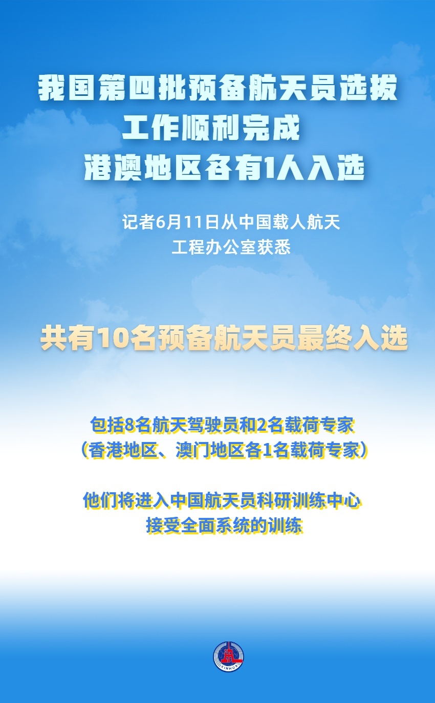 新华社北京6月11日电(李国利 杨欣)记者11日从中国载人航天工程办公室获悉,我国载人航天工程第四批预备航天员选拔工作日前结束,共有10名预备航天员最终入选,包括8名航天驾驶员和2名载荷专家(香港地区、澳门地区各1名载荷专家)。后续,他们将进入中国航天员科研训练中心接受全面系统的训练。