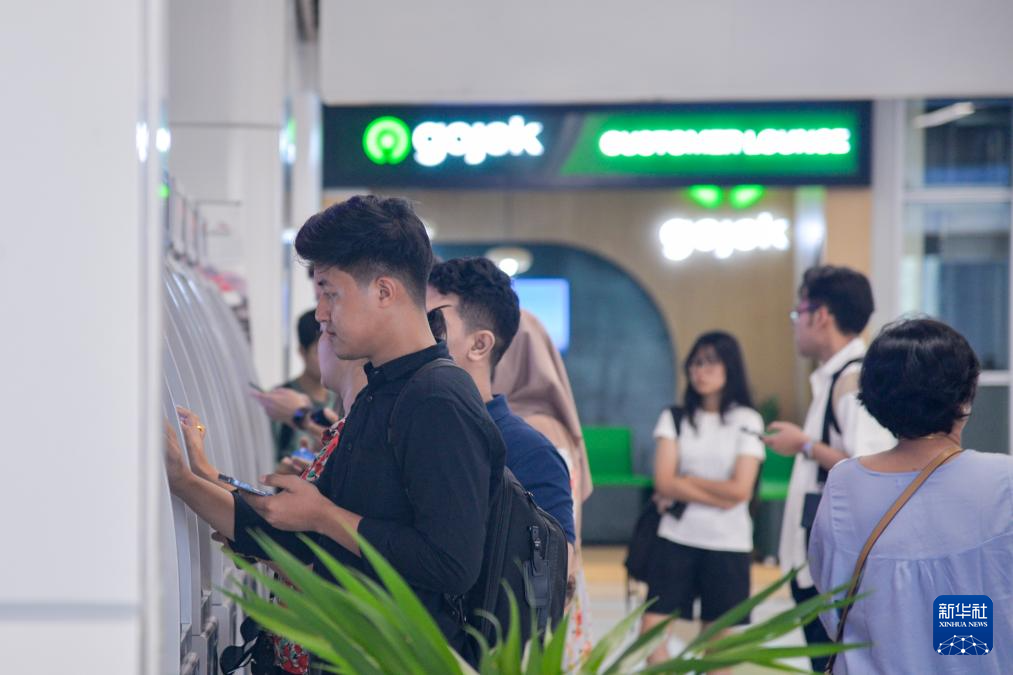 6月17日,在印度尼西亚雅加达哈利姆站,乘客在自助取票机前取票。