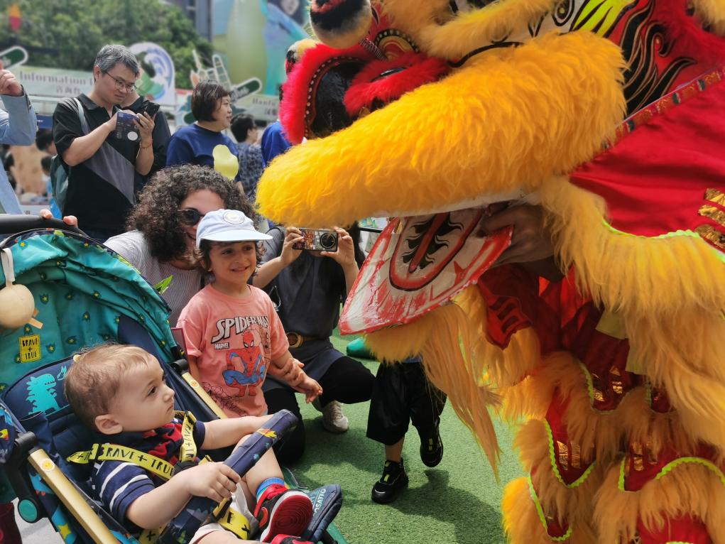 6月9日,端午小长假第二天,在上海金桥的一处商业中心里,外国小朋友近距离观看传统舞狮。新华社记者 陈爱平 摄
