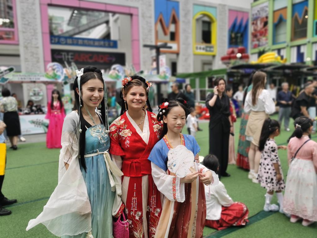 6月9日,端午小长假第二天,在上海金桥的一处商业中心里,身着中国古代服饰的外国人与中国儿童合影。新华社记者 陈爱平 摄