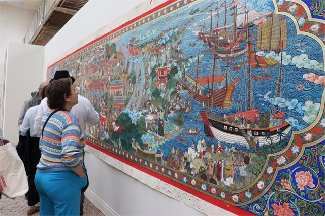 展览现场,由泉州市赛雄文化发展有限公司、泉州文旅集团、北京凤凰数字科技有限公司联合推出的《世界商埠》壁画吸引了大量法国观众驻足观看。