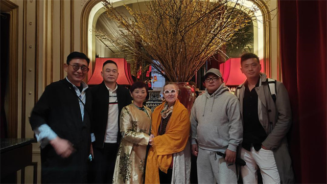 活动现场,吴静华(左三)及《世界商埠》团队成员与法国国家美术协会执行主席伊莎贝拉・罗森(右三)、沙龙展中国区主席宋冬(左一)等合影。 吴静华供图