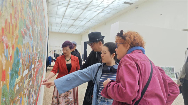 展览现场,吴静华(右一)向游客介绍作品。吴静华供图