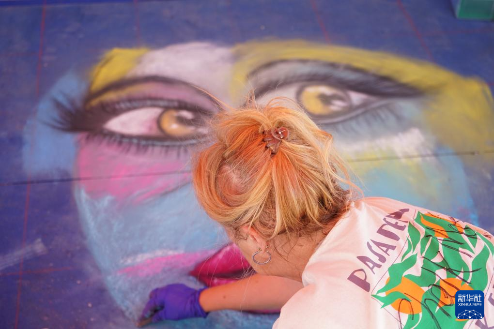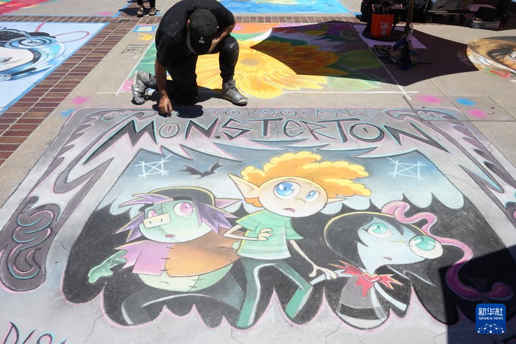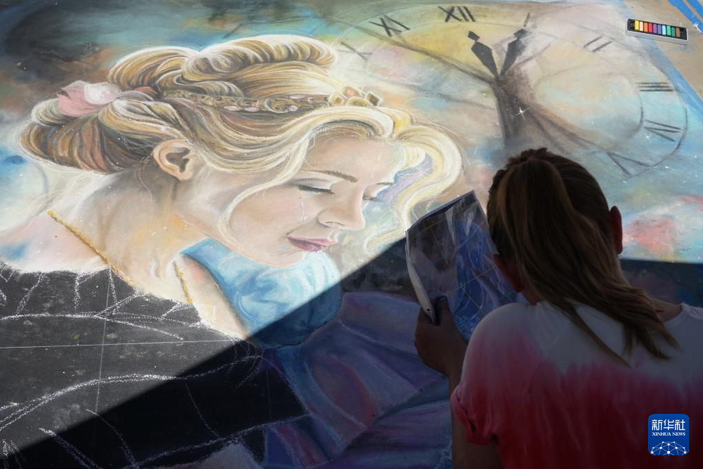 6月23日,艺术工作者在美国加利福尼亚州帕萨迪纳市举行的粉笔画节上创作。
