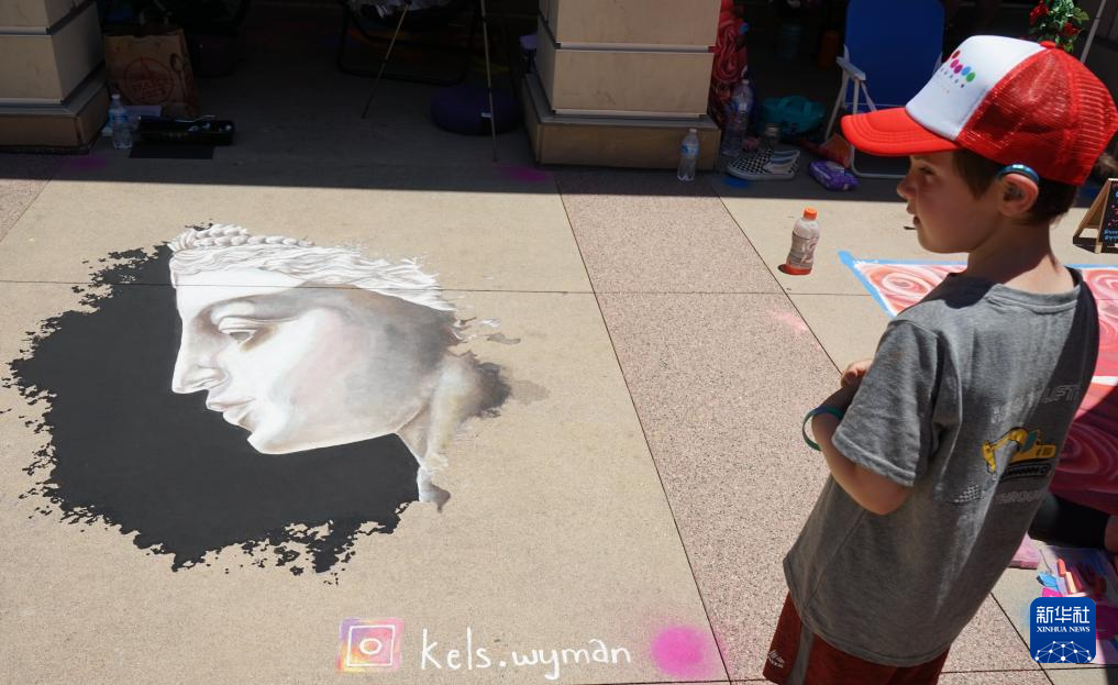 6月23日,一名儿童在美国加利福尼亚州帕萨迪纳市举行的粉笔画节上欣赏粉笔画作品。