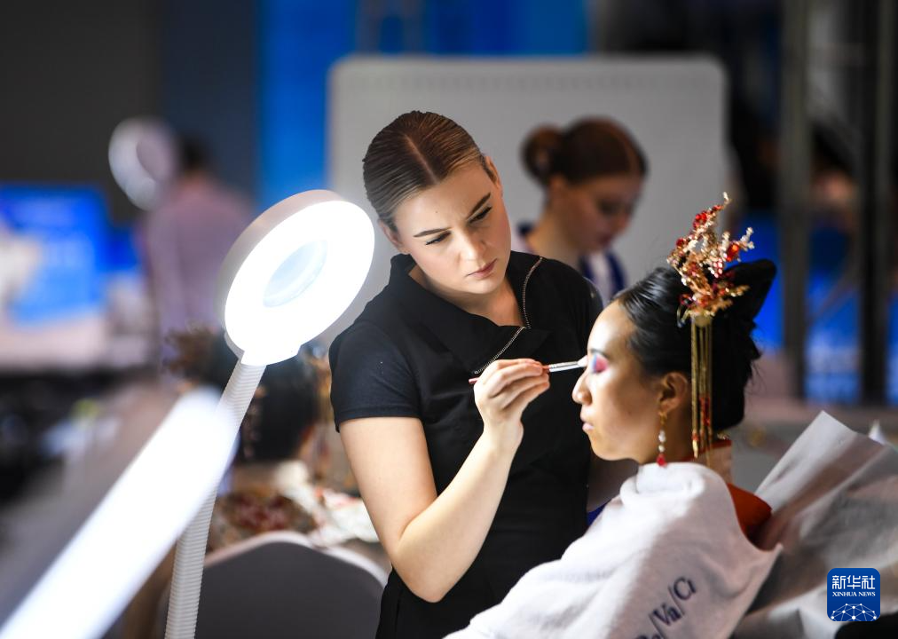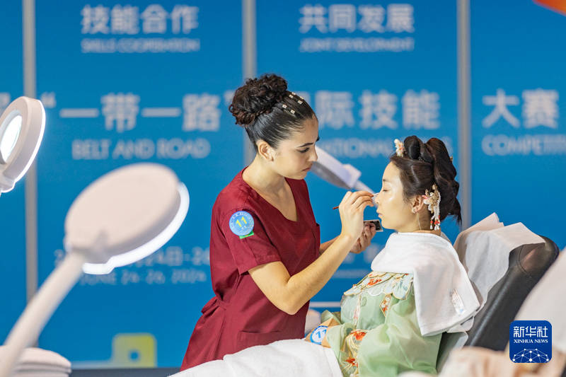 6月24日,第二届“一带一路”国际技能大赛美容项目选手在比赛中。新华社记者 王全超 摄