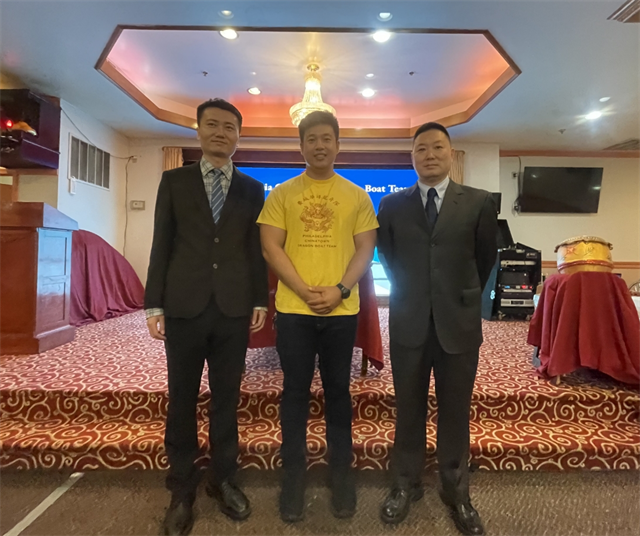 领事王程、费城华埠龙舟队队长陈威、领事陈曲锋(由左至右)
