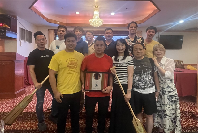 活动中,陈威代表龙舟队为捐款一千美元以上赞助人颁发纪念品。