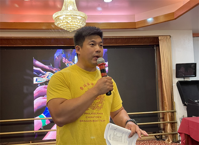 费城华埠龙舟队队长陈威在致辞中向父老乡亲和社团侨领对龙舟队的支持及中国驻纽约总领馆领事陈曲锋、王程参加本次活动表示感谢。陈威表示,划龙舟能在异国他乡受到关注,有赖于大家的支持和鼓励。龙舟队在今年华盛顿龙舟比赛中取得了好成绩,为在美华侨华人赢得了的荣耀。最后,陈威向赞助本次筹款活动的单位和个人表示感谢。
