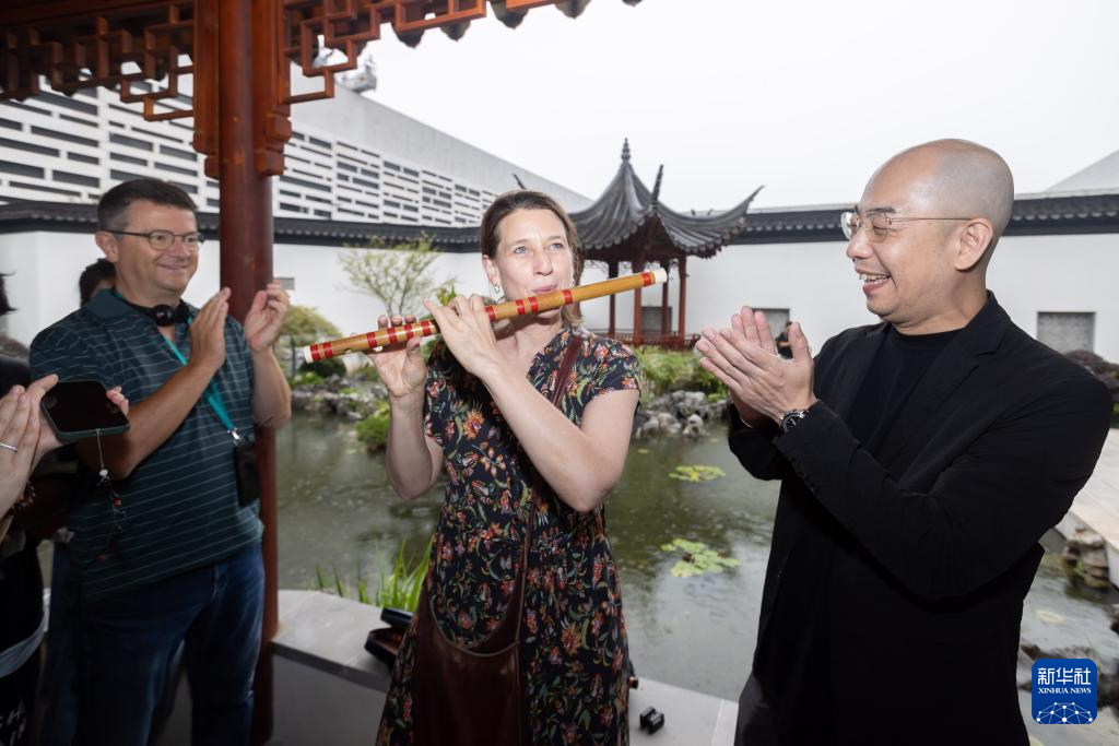 6月25日,柏林爱乐乐团的乐手在尝试吹奏中国竹笛。