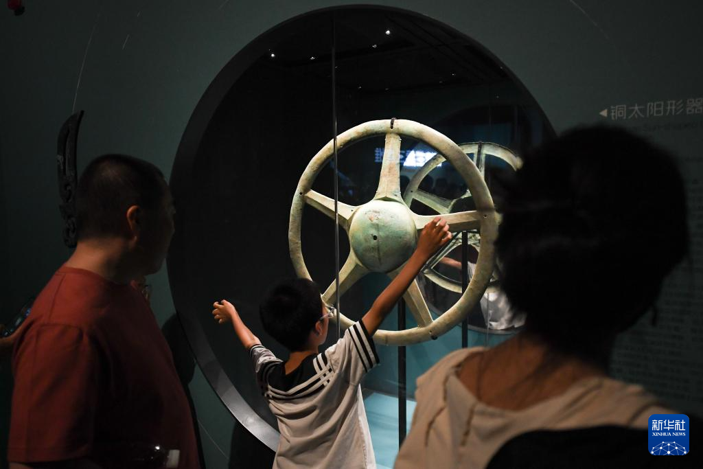 6月27日,观众在观看展品青铜祭坛零件(铜龙形器)。