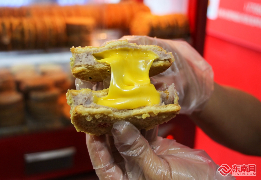 芋泥在泉州饮食文化中占有重要的地位,是许多传统美食的主要原料。在泉州,芋泥被广泛用于制作各种美食,而芋头饼便是其中之一,泉州芋头饼的传承历史悠久,许多家庭代代相传,将其作为传统手艺和美食文化的一部分。随着时间的推移,一些知名的芋头饼商家如“坤记芋头饼”逐渐崭露角,以其独特的口感和制作工艺赢得了广大食客的喜爱。厚厚的芋泥夹在薄脆的饼干间,裹满秘制面糊,放入油锅中稍稍炸制金黄捞出,这便是芋头饼。