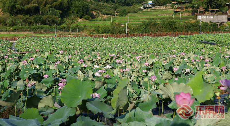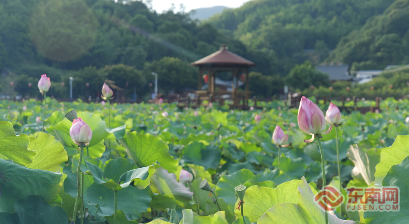 FJSEN report on July 1 (FJSEN reporter Ye Fuguo, correspondent Zhang Yu) The grass and woods come to the best time of the year and cicadas sounds tell us that it is summer. On June 27, it is a full sight of blooming lotus in the ponds in Xiaping Village, Chongru Township, Xiapu County, Ningde, which is full of layers of lotus leaves, and streams of tourists and citizens are attracted to enjoy the sight as well as stay away from the summer heat.