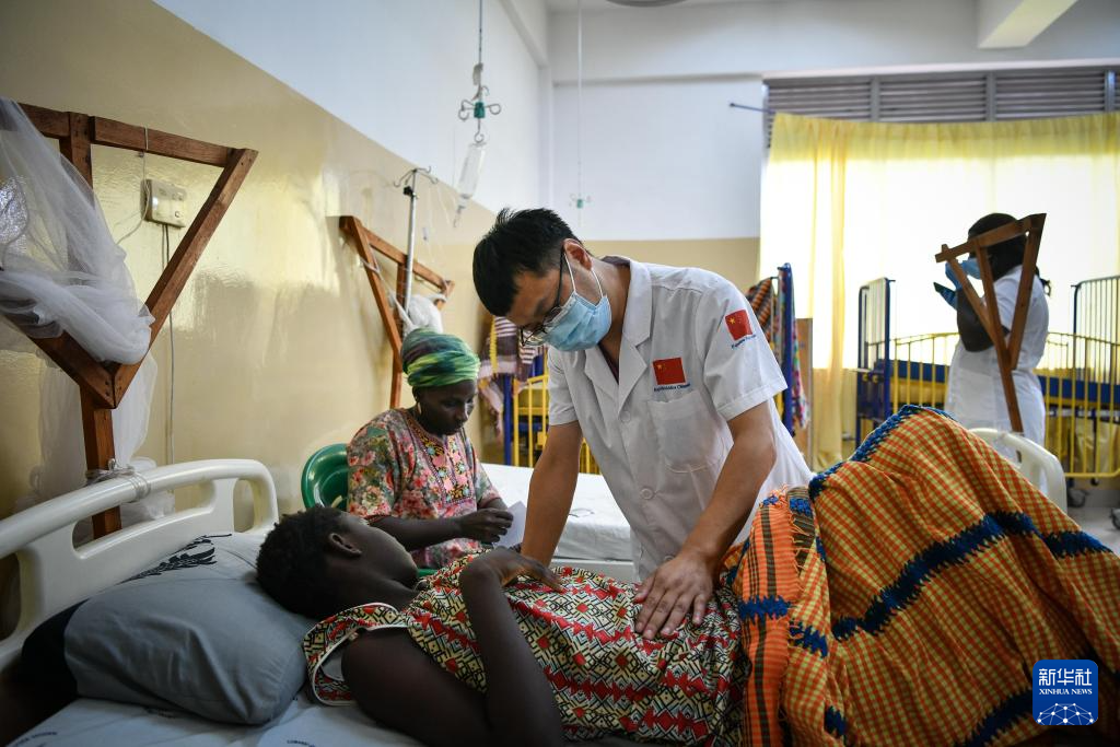 7月8日,在位于几内亚比绍首都比绍的中几比友谊医院,中国医生和当地医护人员一起查房。