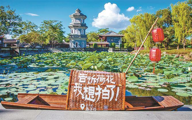 Xiamen Yuanbo Garden,"meeting" black awning boat with lotus pond. (Photo by reporter Lu Jianhao)