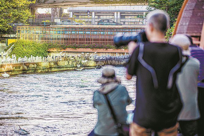 观鸟爱好者在筼筜湖边拍摄鸟类。(图/记者 卢剑豪)