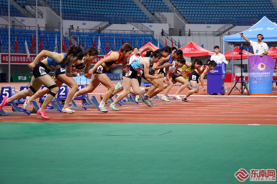 女子丙组100米预赛现场,运动员们闻令启动。东南网记者 郑正华 摄