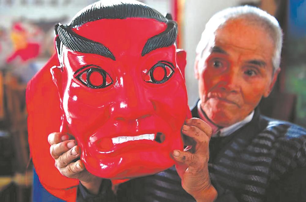 国家级非遗传承人龚茂发展示傩面具。(东南网通讯员 林传仁 摄)