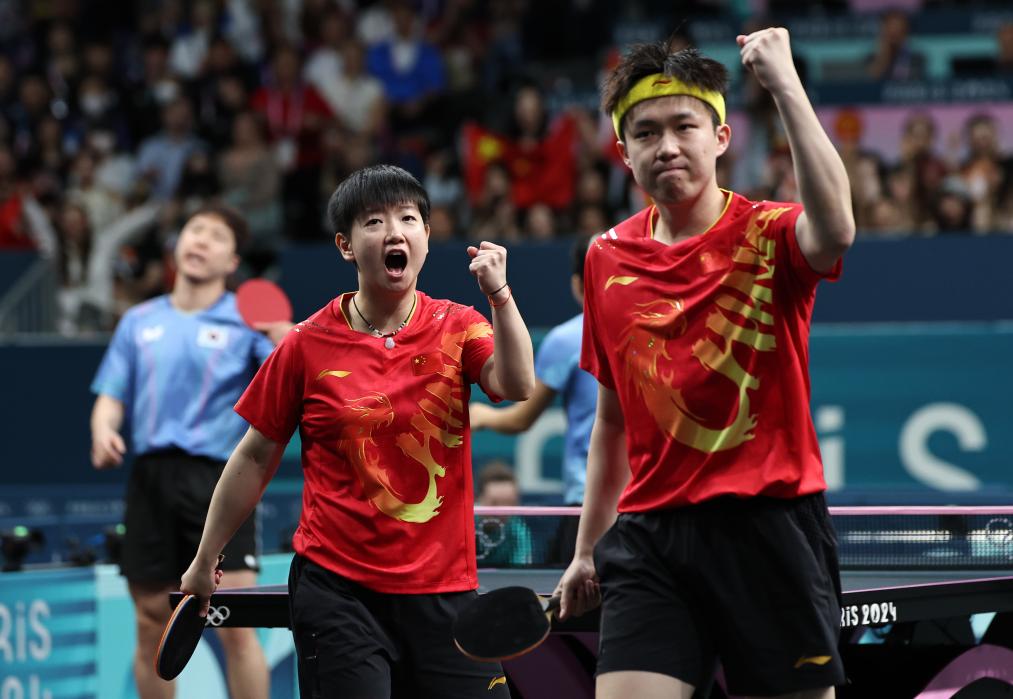 7月29日,王楚钦/孙颖莎(左)在比赛中庆祝得分。 新华社记者 王东震 摄