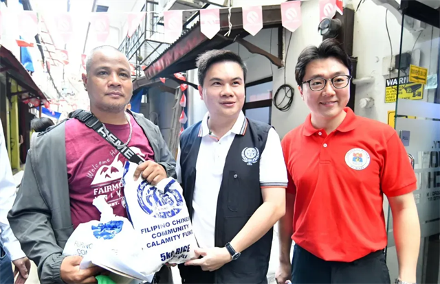 菲律宾福建总商会常务副会长吴永坚(中)、秘书长蔡臻蔚(右)向当地民众分发赈济品