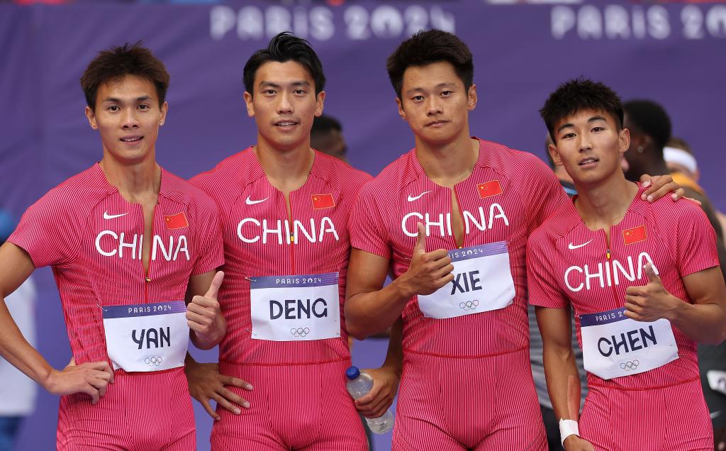 8月8日,中国队选手陈佳鹏、谢震业、邓智舰、严海滨(从右至左)在比赛后。新华社记者 李明 摄