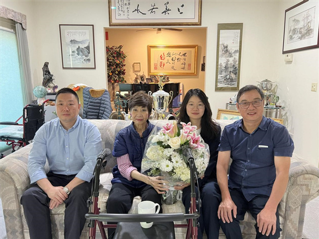 陈曲峰(左一)、邢玉临(左三)在总会共同主席郭瑞尧(右一)的陪同下探望林洁辉(左二)。林洁辉供图