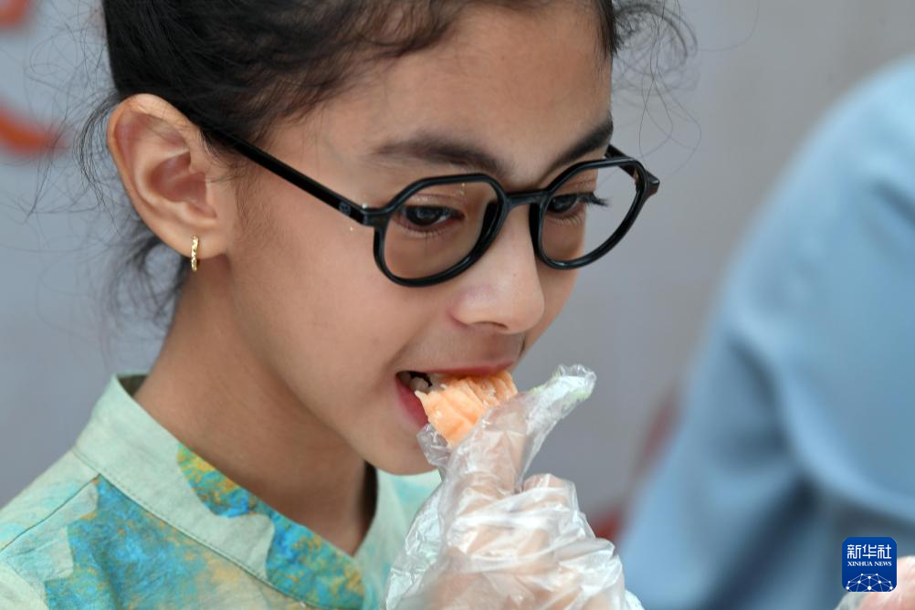 9月15日,在伊朗首都德黑兰,一名儿童在中秋月饼制作体验活动上品尝月饼。新华社记者 沙达提 摄
