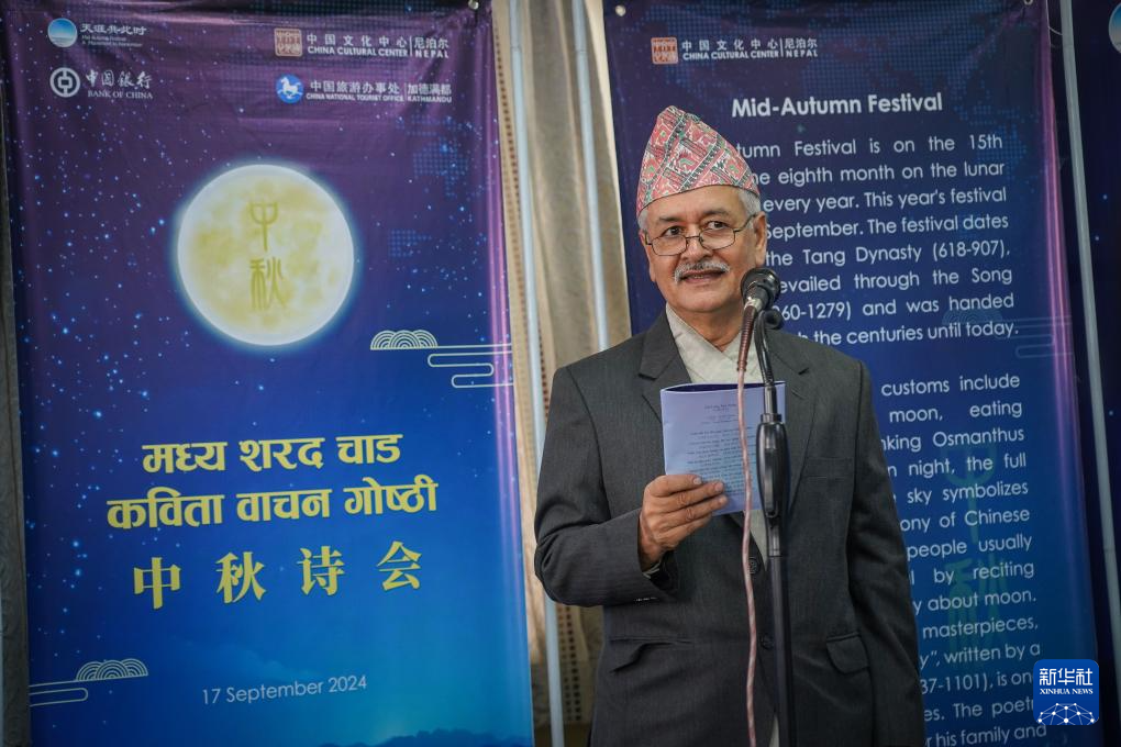 9月17日,在尼泊尔首都加德满都,一名男子在“天涯共此时——中秋诗会”上朗诵诗歌。新华社发(哈里·马哈尔詹 摄)
