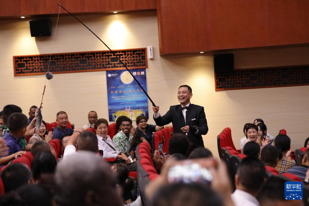 9月17日,在斐济苏瓦市政厅,演员在“知音湖北·遇见斐济——天涯共此时中秋晚会”上表演魔术时与现场观众互动。新华社发(桑钦龙 摄)